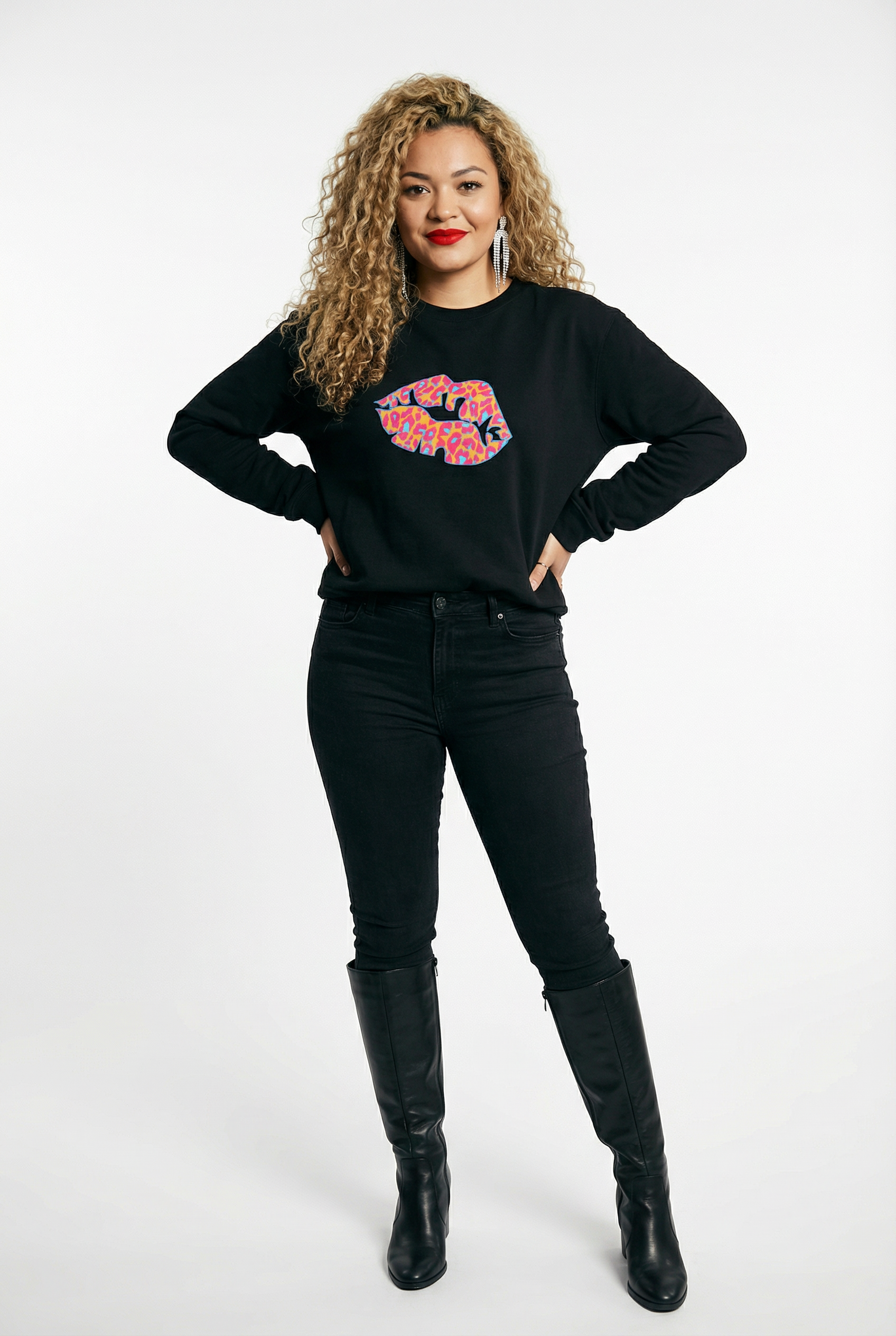 Black Oversize Sweatshirt With Orange And Blue Leopard Lip Print.