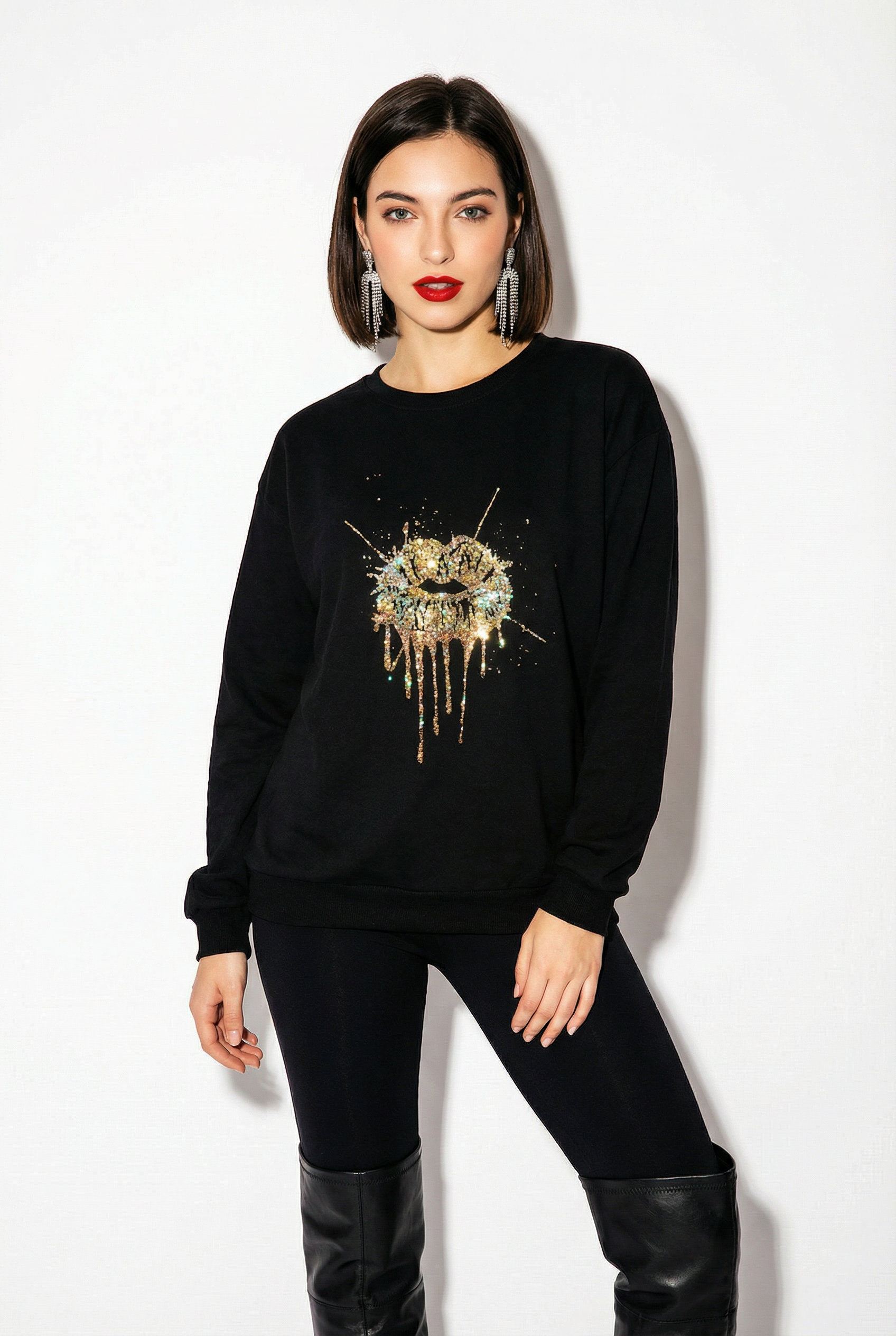 Gold Drip Splat Lip Print Jumper In Black. This comfy tee is a unique handmade item.