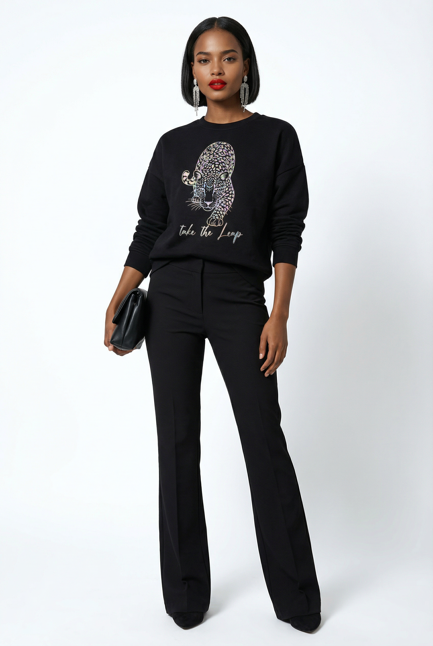 Take a step toward bold style with the Gold Take the Leap Leopard Sweater in Black. Featuring a striking gold leopard on the prowl and empowering “Take the Leap” text, this sweater blends luxury vibes with fearless energy.