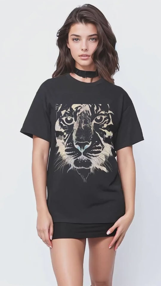 The Gold Fierce Tiger T-Shirt in Black delivers head-turning street style with a striking metallic gold tiger face graphic that demands attention.