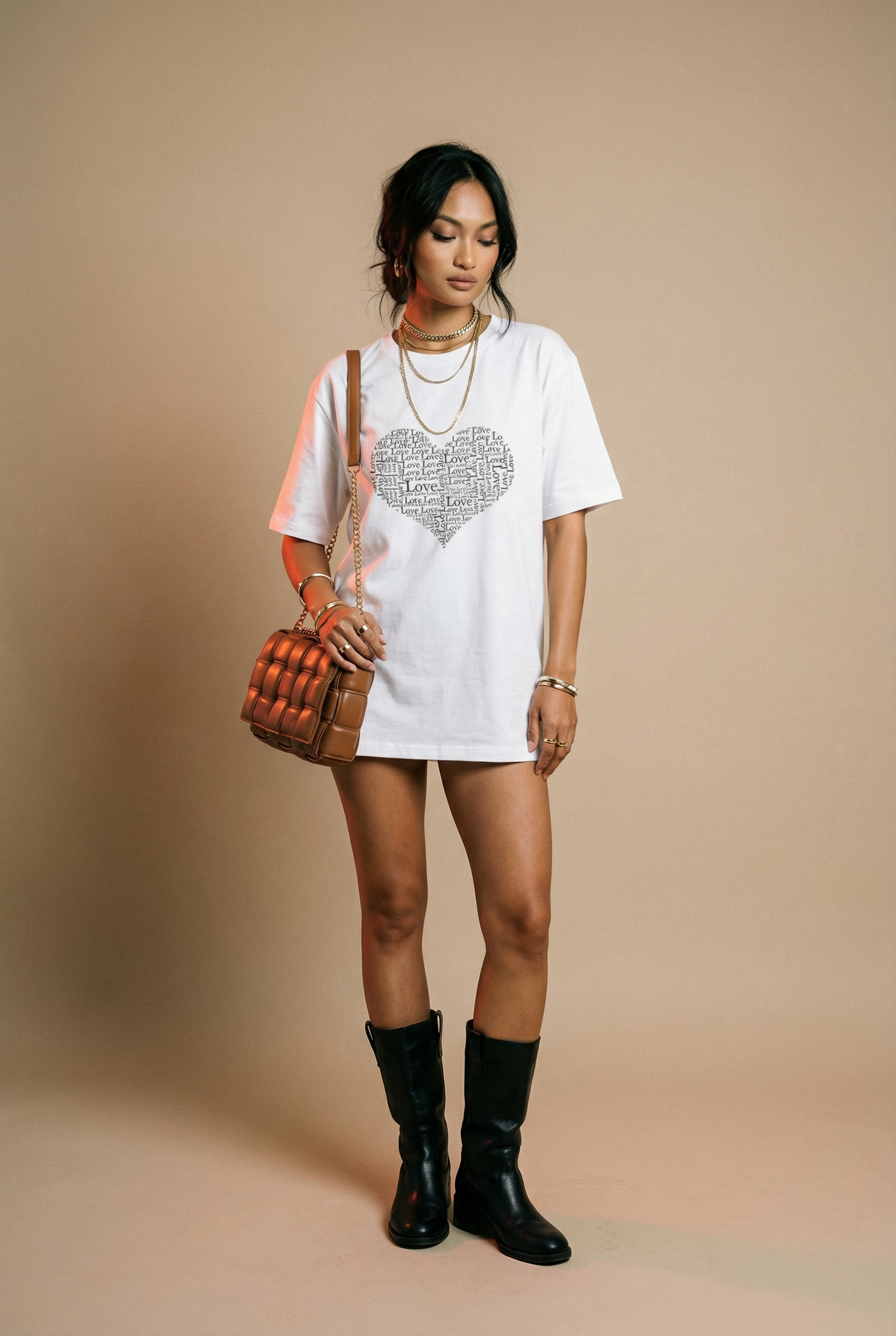 Love Heart Text Print Tshirt In White White. A short sleeve oversize polyester t-shirt.