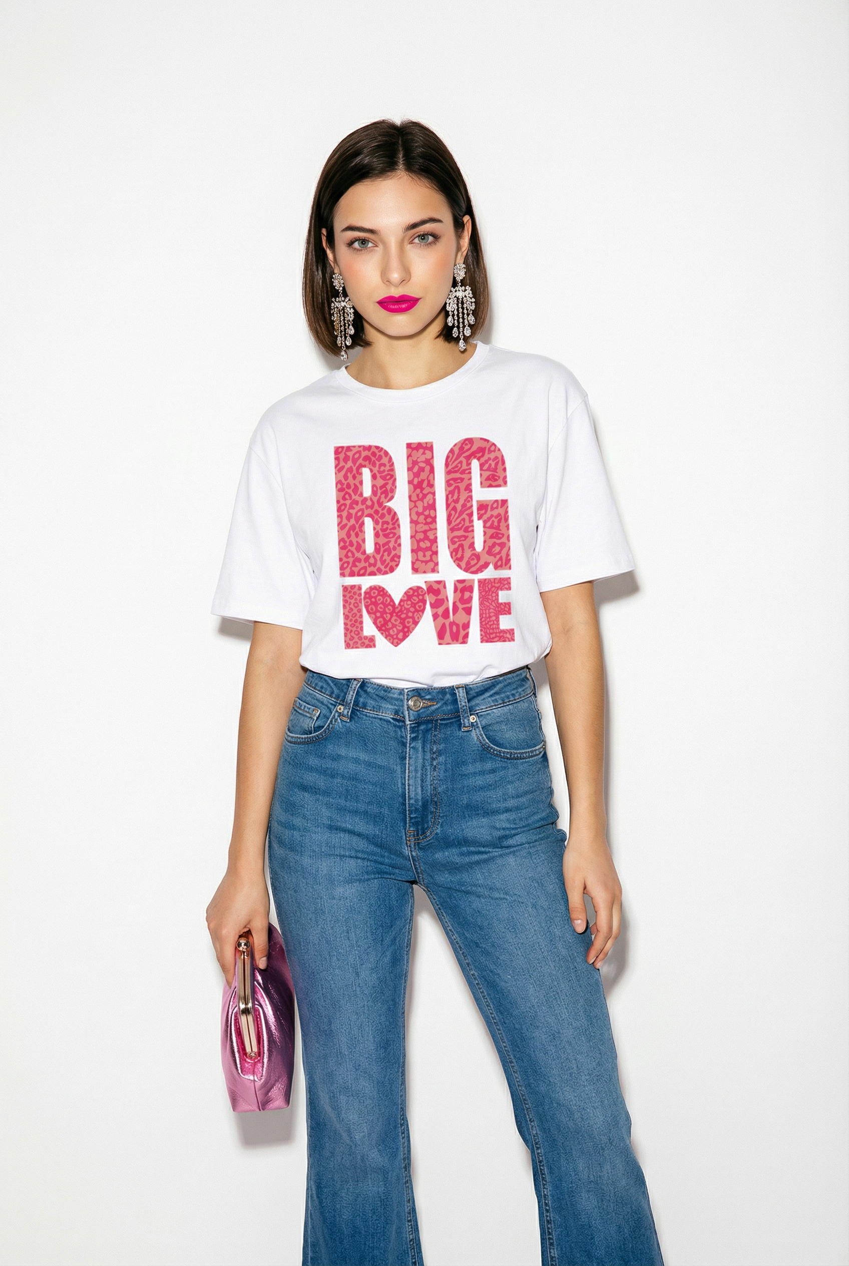 Spread love with wild flair. This white tee features bold LOVE lettering in a vibrant pink leopard print, creating a playful yet stylish statement piece.