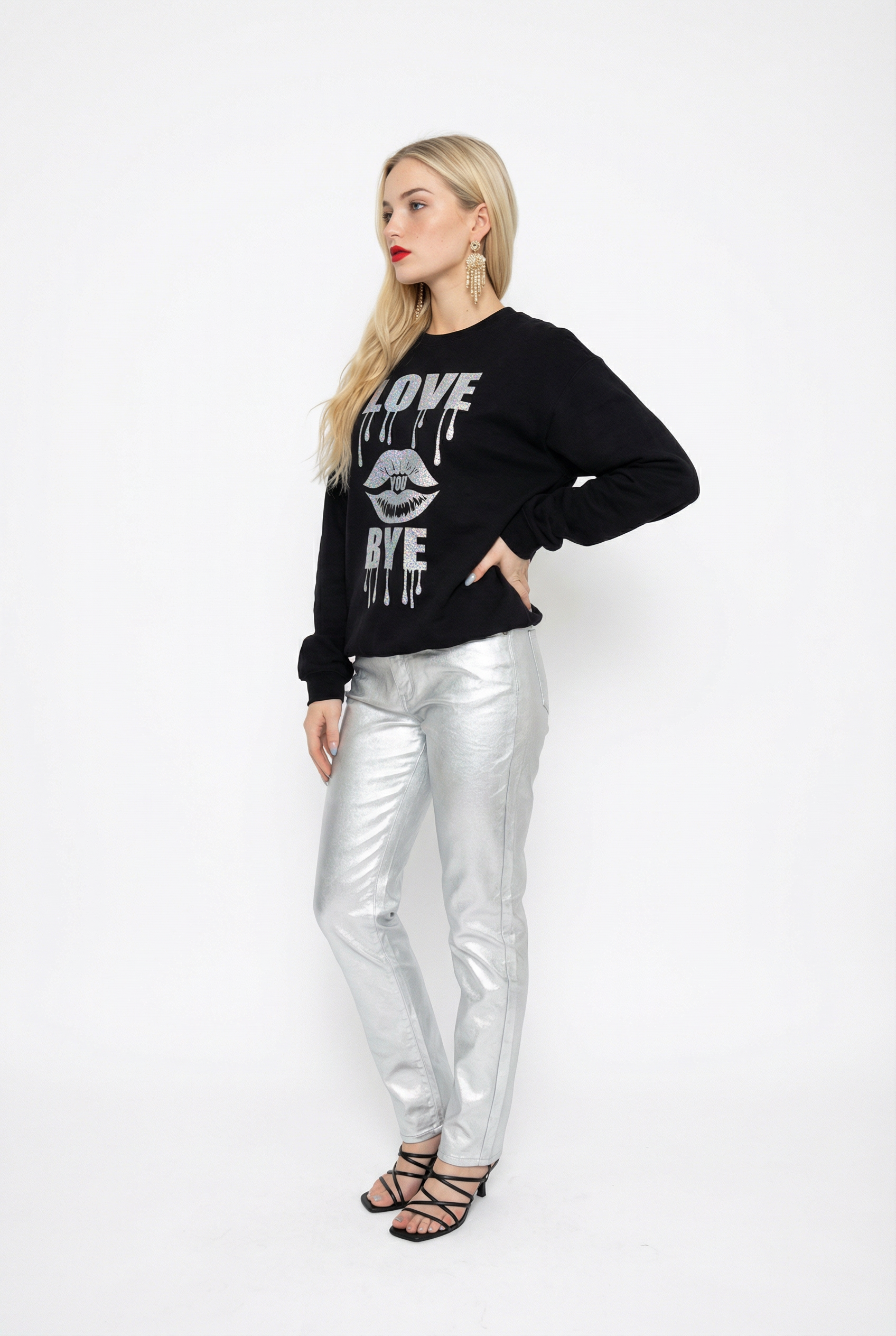 Say it with sass in the Love You Bye Lip Drip Sweatshirt. Featuring bold silver dripping lips and a cheeky sign-off message. The Love You Bye Lip Drip Sweatshirt blends edgy graphics with everyday comfort. The bold lip drip design pops against the clean black background, while the quirky text brings personality to your outfit.